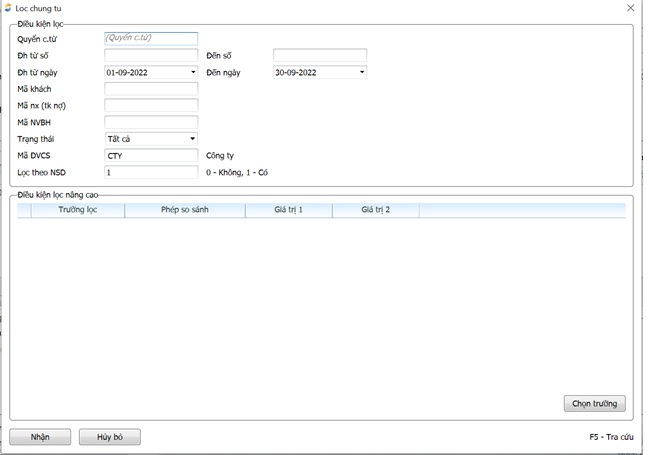 - Bước 2: Hệ thống sẽ hiển thị ra trang lọc chứng từ, bạn hãy điền đầy đủ các điều kiện lọc và bấm vào mục “Nhận” ở góc dưới bên phải.
