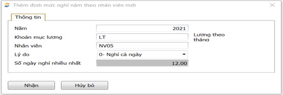 Mỗi nhân viên theo quy định sau khi ký hợp đồng lao động chính thức sẽ có 12 ngày nghỉ phép trong năm. Số ngày nghỉ phép đó được nhập ở khai báo định mức nghỉ năm cho từng nhân viên và nhập theo nhóm nhân viên trong khoản mục lương.