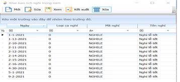 Sau khi khai báo có bảng các ngày nghỉ sau: