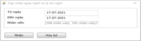Chức năng này cho phép cập nhật thông tin nhân viên nghỉ, vắng mặt do các phát sinh nghỉ phép, nghỉ ốm, nghỉ không lương.
