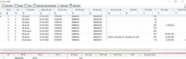 - Nhấn “chọn yêu cầu mua hàng” để truy vấn các báo giá của một yêu cầu mua hàng