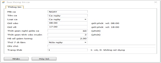 - Loại ca: Có 3 loại ca: Ca ngày, Ca đêm, Ca tối. Ca tối là ca bán thời gian cho phép nhập thời gian tự do có thể là buổi sáng, buổi chiều hoặc buổi tối.