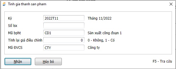 - Chức năng: Căn cứ vào số lượng thành phẩm nhập kho, các loại chi phí được tập hợp và phân bổ, chương trình cho phép tính giá thành sản phẩm tự động