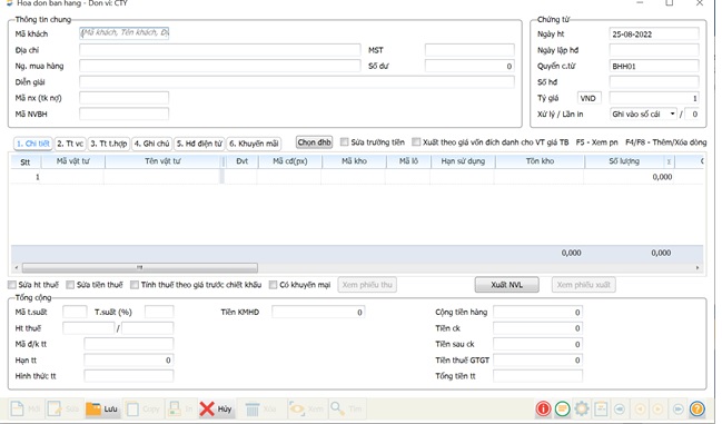 - Chức năng: Lập chứng từ bán vật tư, hàng hóa có theo dõi về số lượng, giá cả, thuế GTGT đầu ra HĐBH cập nhật doanh số bán hàng, ghi nhận giá vốn, giảm trừ hàng tồn kho.