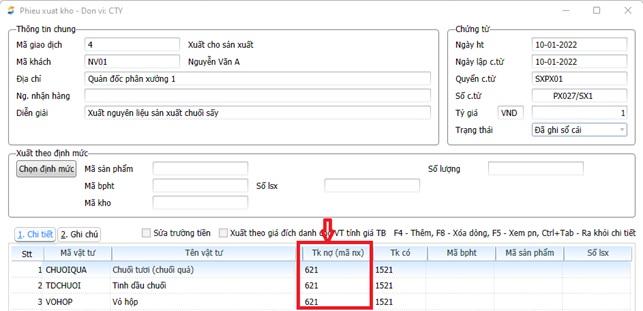 - Nếu lúc khai báo danh mục vật tư mà quên chưa nhập “TK chi phí nguyên vật liệu”- 621 thì khi tạo phiếu xuất kho người dùng phải nhập tài khoản này vào mục Tk nợ (mã nx)