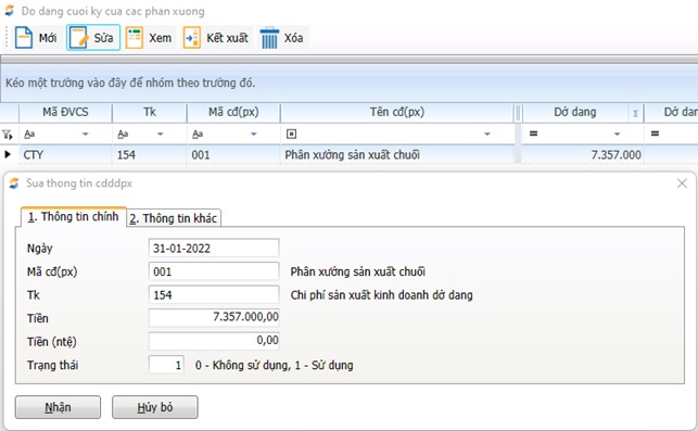 - “Thêm mới” số dư đầu sau đó khai báo các thông tin: Tài khoản theo dõi sản phẩm dở dang (154), mã cđ (Px) – để tập hợp chi phí theo phân xưởng, Dư nợ ban đầu: 15.000.000 VNĐ
