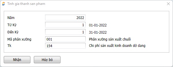 Đường dẫn: Chi phí, Giá thành/Giá thành công đoạn, định mức/Tính chi phí giá thành/Tính giá thành sản phẩm