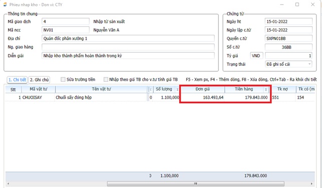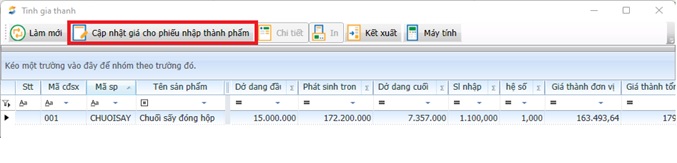 Bước 5: Cập nhật giá cho các phiếu nhập kho thành phẩm