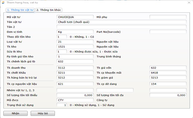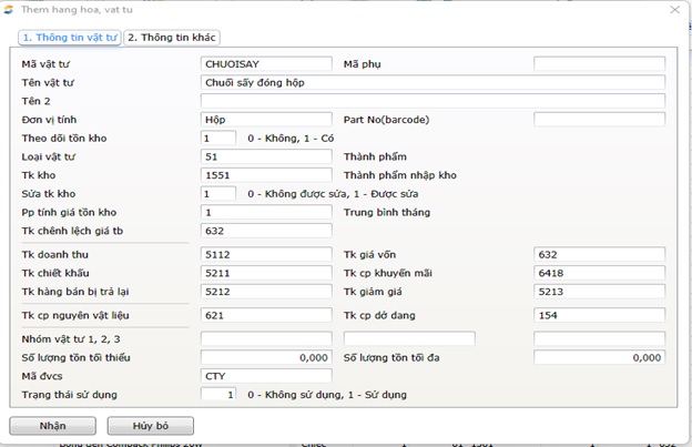 Lưu ý: Phải chọn Loại vật tư: 21-Nguyên vật liệu; Tài khoản kho: 152 – Nguyên vật liệu (tuỳ nhu cầu quản lý có thể để tài khoản chi tiết của 152); Tài khoản chi phí nguyên vật liệu: 621 (Để khi xuất kho NVL sản xuất, phần mềm tự hạch toán chi phí NVL vào TK:621); chọn phương pháp tính giá tồn kho mà doanh nghiệp đang sử dụng và chọn mã ĐVCS nếu như hạch toán riêng cho từng ĐVCS