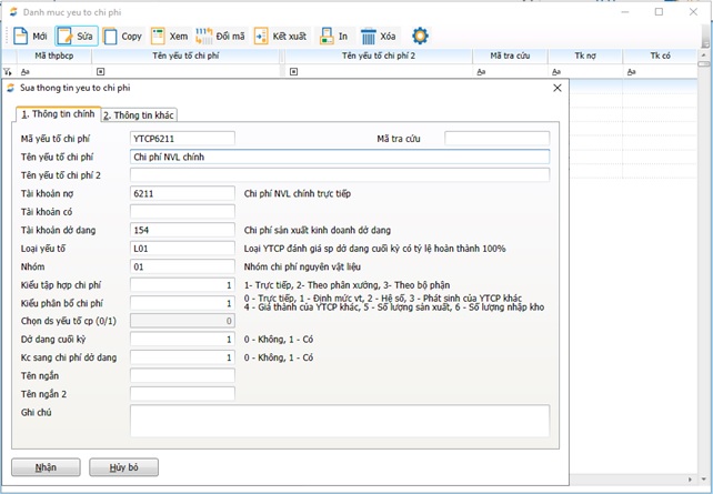Bước 1: Khai báo các danh mục từ điển, hệ số, định mức, cách thức tập hợp và phân bổ chi phí