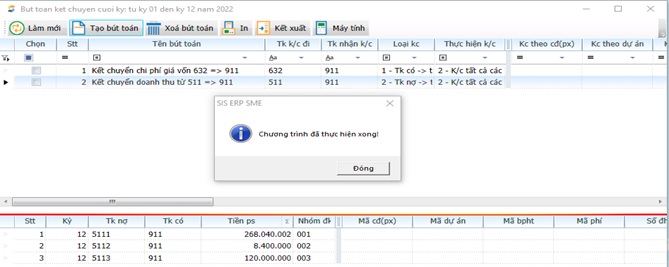 Chức năng: Cho phép thực hiện kết chuyển doanh thu, chi phí, thuế giá trị gia tăng cuối kỳ: