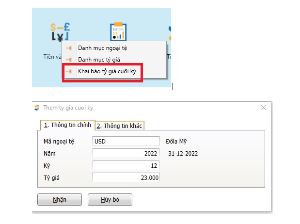 Để tính được chênh lệch tỷ giá cuối kỳ, ta phải khai báo tỷ gái cuối kỳ