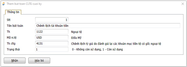 Đường dẫn: Kế toán tổng hợp\ Cập nhật số liệu\ Khai báo bút toán chênh lệch tỷ giá cuối kỳ