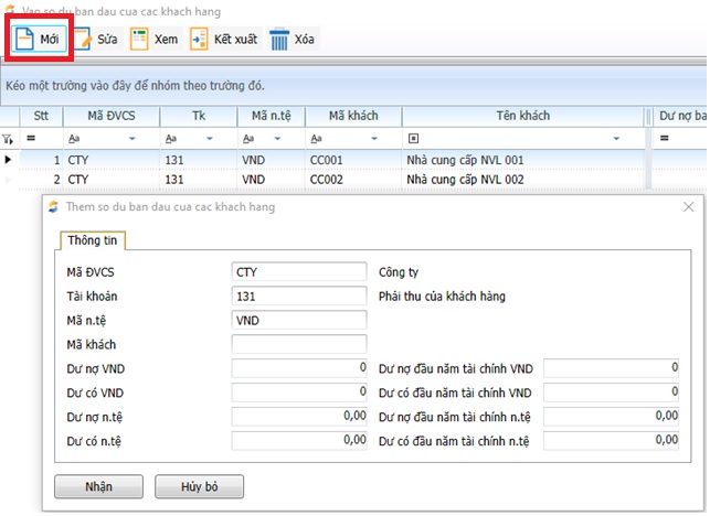 - Tiếp theo nhập số dư vào phần “Dư Nợ VND” với khách hàng có số dư bên Nợ, nhập vào “Dư Có VND” đối với khách hàng có số dư bên Có, hoặc nhập cả hai với khách hàng có số dư ở cả hai bên.