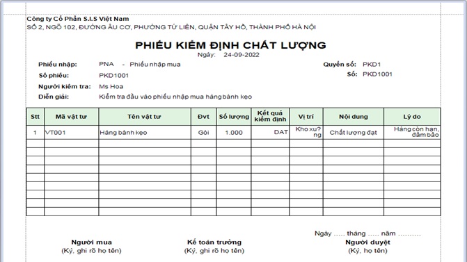 - Chức năng này cho phép người dùng nhập liệu kết quả kiểm định chất lượng hàng hóa đầu vào, nhập mua hoặc nhập kho thành phẩm.
