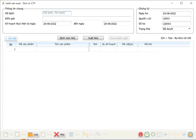 - Chức năng: Khai báo lệnh sản xuất sử dụng trong trường hợp tính giá thành theo lệnh sản xuất.