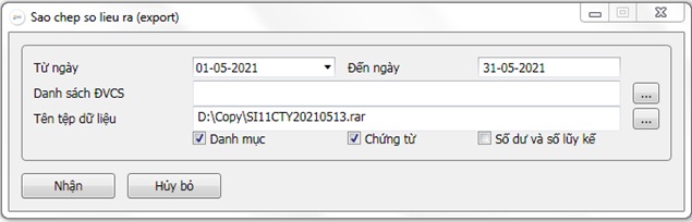 - Chương trình cho check chọn các dạng số liệu sẽ sao chép ra: Danh mục, chứng từ, số dư và số lũy kế