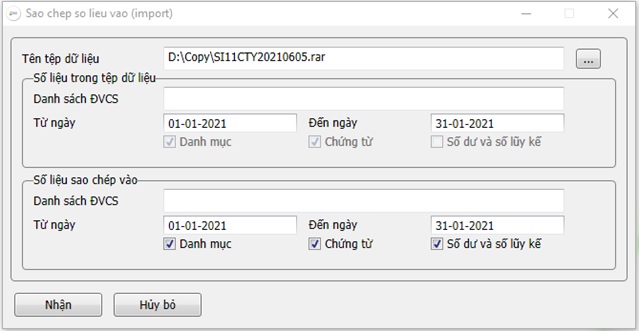 Đường dẫn: Hệ thống\ Quản lý số liệu\ Sao chép số liệu vào (import)