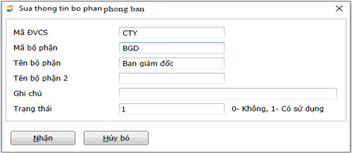 Danh mục bộ phận, phòng ban