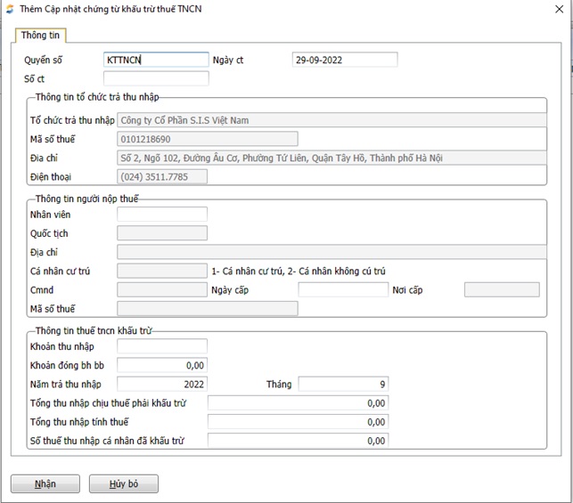 Tiền lương\ Cập nhật lương\ Cập nhật chứng từ khấu trừ thuế TNCN