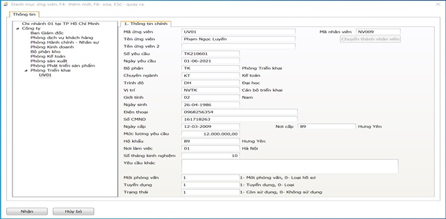 - Bước 4: Nhấn <<Nhận>> để lưu thông tin ứng viên