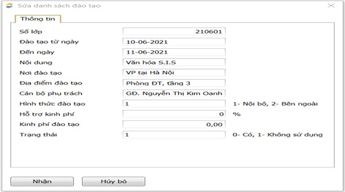 Đường dẫn: Nhân sự\ Tuyển dụng, đào tạo \ Các khóa đào tạo