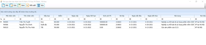 Sau khi nhập thông tin chứng nhận kết quả cho các nhân viên mới, có bảng dữ liệu sau: